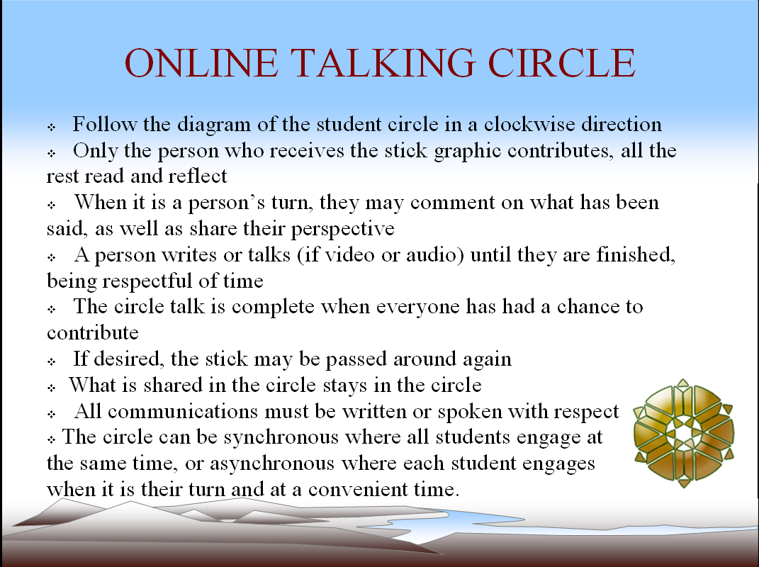 Online course management systems provide several applications that can be used to apply the talking circle process within the virtual learning environment. Although presence is a key ingredient of effective talking circles, the teacher or guide can facilitate at least a semblance of web presence within the activity.